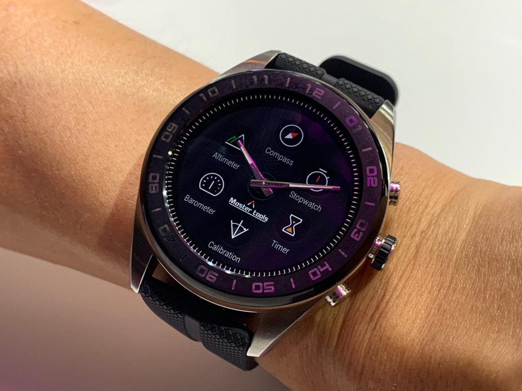 Pero primero, lo básico. El W7 tiene un hermoso cuerpo inoxidable que, lamento decirlo, será demasiado grande para mucha gente. Se veía relativamente bien amarrado a mi muñeca, pero el W7 parecía absolutamente masivo en otra persona a mi izquierda. Si tienes brazos muy delgados, básicamente puedes escribir esta cosa ahora mismo.