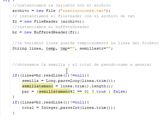 Se lee el archivo de texto que contiene la “semilla” y el numero “n” que indica cuantos Pseudoaleatorios se generan.